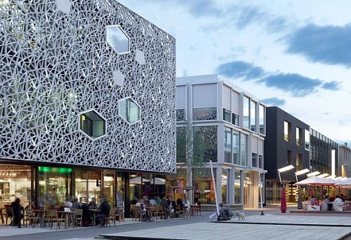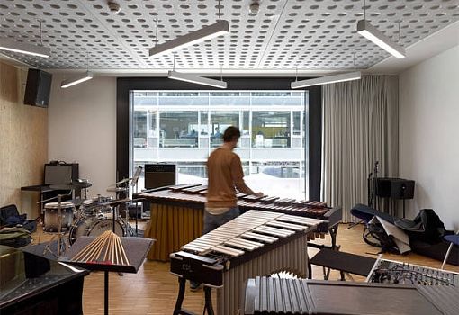 Лозанна – это город, в котором искусство и культура играют важную роль. Старый складской комплекс дю Флон, построенный в 1900 году, за последние десятилетия утратил свое промышленное значение, превратившись в культурно-торговый «городок». Тем не менее, архитекторы сохранили характер этих ортогональных конструкций с их особой атмосферой. Известная базельская архитектурная фирма Burckhardt + Partner спроектировала здесь три новых здания, объединяющих историю с современностью. Расположенные в самом сердце комплекса, они все разные, но связаны четкой прямоугольной структурой. Изюминка этого «трио» – строение, спрятанное за белыми ажурными решетками. В одном из зданий довольно необычный дизайн интерьера. Здесь разместились музыкальная школа и концертный зал «Haute Ecole de Musique» (HEMU) на 300 человек. Огромные шторы позволяют «закрыть» помещение зала, а вместе с этим «сознание зрителей, их витрину понимания» от внешней среды. Так, прозрачные классы на верхних уровнях могут быть использованы как общественные открытые зоны, и как закрытые пространства.