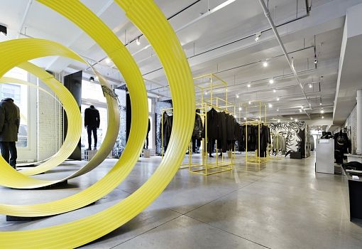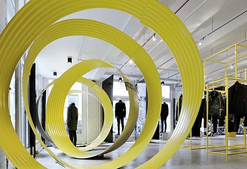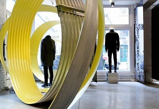 В одном из монреальских бутиков можно увидеть необычную инсталляцию, которая формирует и композиционно объединяет пространство. Произведение дизайнера Себастьена Бретона (бюро B3) представляет собой спираль, скрученную из широких полос гофрированных листов оцинкованного металла. Для соответствия общей колористической композиции окружающего пространства инсталляция окрашена в желтый цвет.