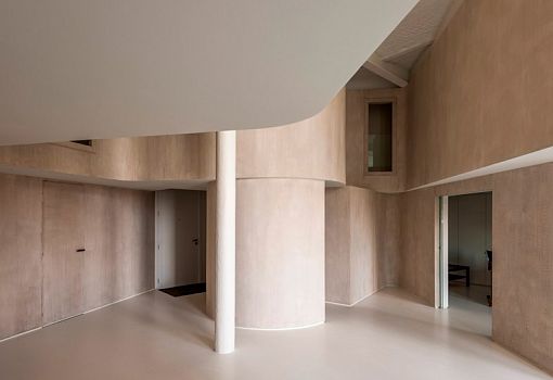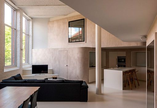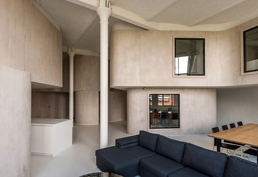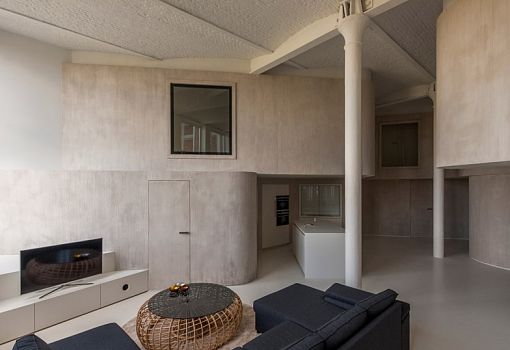 «Дизайн лофта – это упражнение в фильтрации света», - сказал директор бельгийской архитектурной студии Graux & Baeyens о своей последней работе, осуществленной в Кортрейке (Бельгия). Перед архитекторами была поставлена задача превратить заброшенный заводской склад площадью 150 кв. м в комфортное и стильное жилье для семейной пары с ребенком. Второй свет и большая площадь, а также наличие высоких окон и сводчатого кирпичного потолка натолкнуло дизайнеров на идею создания целого ряда комнат-номеров по периметру помещения. Высокие потолки позволили разделить пространства на два уровня, и таким образом здесь появились дополнительные 92 кв. м жилой площади. «Конструкция состоит из двух уровней. Уникальность места создается вариациями вогнутых и выпуклых линий, консолей и потолков двойной высоты», - прокомментировали свою работу архитекторы.