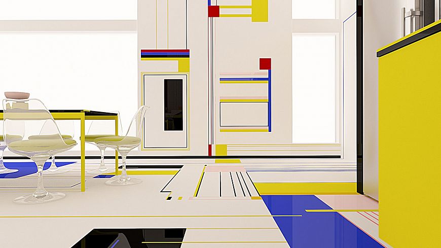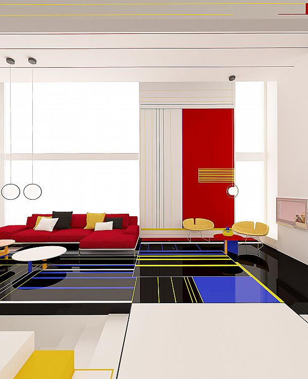 «Своей работой мы хотели бы вызвать у зрителя те же эмоции, что вызывали картины Мондриана. В идеале обитатели квартиры и их гости должны почувствовать себя частью танцевального действа», - говорят авторы. – Это танец форм и цветов, причем черный и белый используются в качестве интервалов. Белый цвет более активен, тогда как черный, наоборот, - пассивен. Танец – форма свободы, он символизирует гармонию души и тела».
