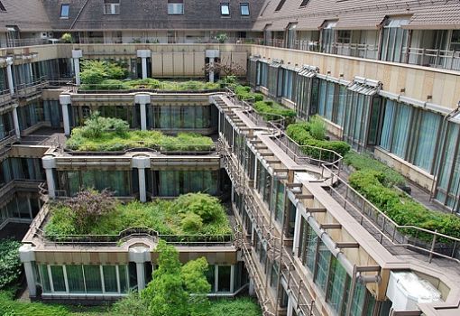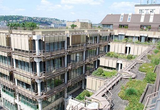 Два основных здания связаны подземными переходами, у каждого есть озелененные террасы и сады на крыше. Три десятилетия назад для организации озеленения использовались защитный флис, защита корня толщиной 0,8 мм, 10 см дренажа Perl 8/16, коврик-фильтр, а также подложка толщиной 30-40 см. Сегодня дренаж состоит из вспененного сланца, керамзита или лавы; коврик-фильтр заменен более тонким и прочным геотекстилем. Подложка также выглядит иначе, чем в 80-х. На зеленых крышах могут быть не только газоны с травой, обрамленные кустарниками и небольшими деревьями, но даже детские площадки или небольшое футбольное поле.