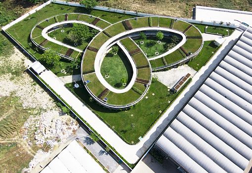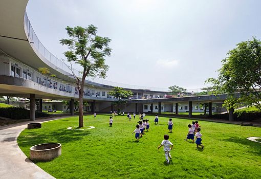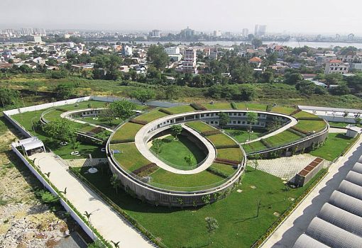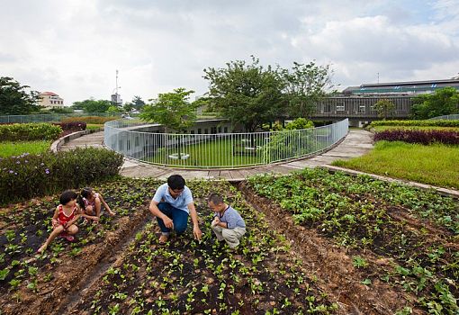 Двухэтажный «сельскохозяйственный» детский сад, созданный во Вьетнаме архитектурным бюро Vo Trong Nghia, довольно необычен. На закрученной в виде петли крыше зеленеет настоящий сад-огород. Объект построен в Донг Най, недалеко Хо Ши Мин-сити. Он был разработан для детей, чьи родители работают на соседней обувной фабрике. Несмотря на ограниченный бюджет, вьетнамские архитекторы постарались возвести здание, соответствующее требованиям устойчивого строительства, где дети могут собственноручно выращивать фрукты и овощи. Для строительства использовались экономичные и доступные материалы, в том числе бетон, кирпич и плитка. Окна, выходящие как на внешнюю сторону, так и во внутренние дворы, обеспечивают естественное освещение и перекрестную вентиляцию по всему зданию.