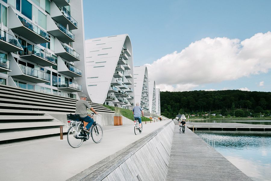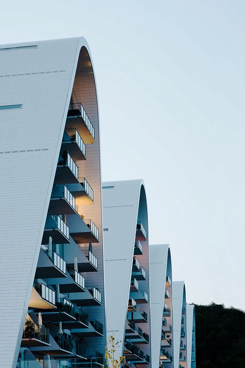 Местность в окрестностях фьорда имеет примечательную деталь – гряду холмов. Они-то и вдохновили авторов проекта на создание этих необычных «природных» объемов. Высота каждой башни – девять этажей; на самом верху запроектированы двухуровневые пентхаусы. Всего в жилом комплексе насчитывается 100 апартаментов разной площади.