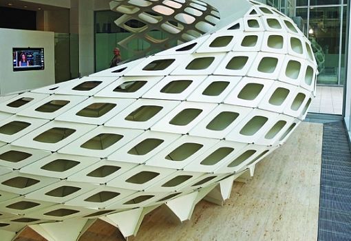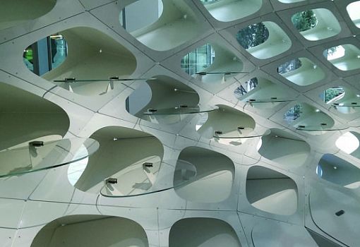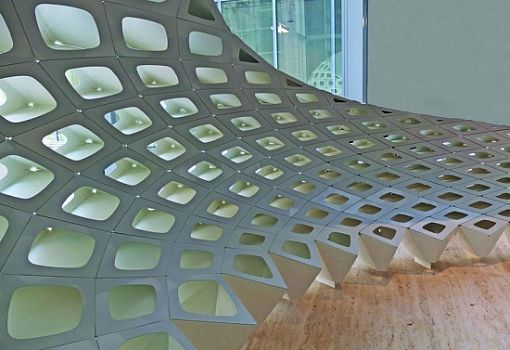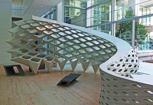 В офисе бюро Gensler (Даллас) можно увидеть произведение инженерной мысли, воплощенное в металле. Инсталляция-экран из отдельных перфорированных объемов (всего 260 криволинейных ячеек) была разработана дизайнерами бюро, после чего они обратились к специалистам по моделированию из компании Arktura. В итоге множество отдельных объемов удалось соединить в единое целое – изящно изогнутую конструкцию со стеклянными полками, которая после установки была оборудована подсветкой.