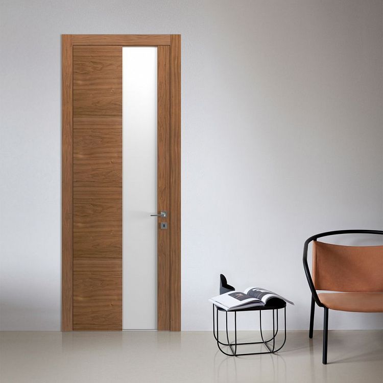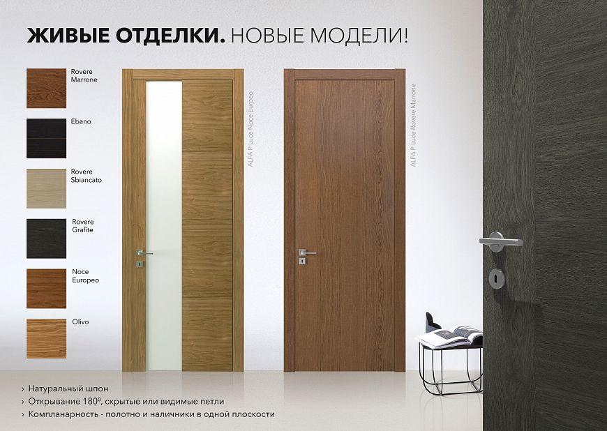 Среди преимуществ этой серии – натуральный шпон, угол открывания 180 градусов, компланарность, то есть расположение дверного полотна и наличников в одной плоскости.