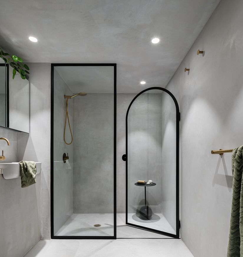 «Пещерный» облик интерьера не должен вводить читателя в заблуждение. Архитекторы использовали такие материалы, как ламинированная клееная фанера, древесина американского дуба, медь и так далее. Да и сам «бетонный монолит», воплощенный в простых геометрических формах, — это на самом деле стеклоармированный бетон (GRC), вполне себе современный практичный материал. Все поверхности в квартире покрыты декоративной отделкой French Wash, имитирующей фактуру крупнозернистой затирки.