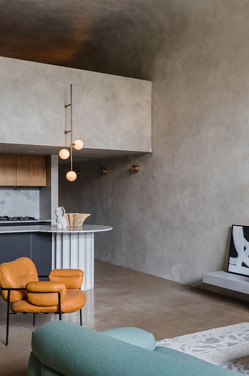 Изначально авторы отталкивались от образа бетонного бункера, нарисованного заказчиками, семейной парой, восхищающейся брутализмом в архитектуре. В идеале нужно было создать «современную пещеру», но не холодную, темную и неуютную, а гостеприимную, залитую светом и комфортную. Присутствие в интерьере солнечного света обеспечило высокое окно, вернее, остекленная стена, расположенная напротив входной двери, в глубине квартиры. Основное помещение нижнего уровня лофта — это кухня-гостиная-столовая. Над этой просторной комнатой запроектирована спальня; вход на антресоль представляет собой маршевую лестницу, примыкающую к одной из стен лофта.