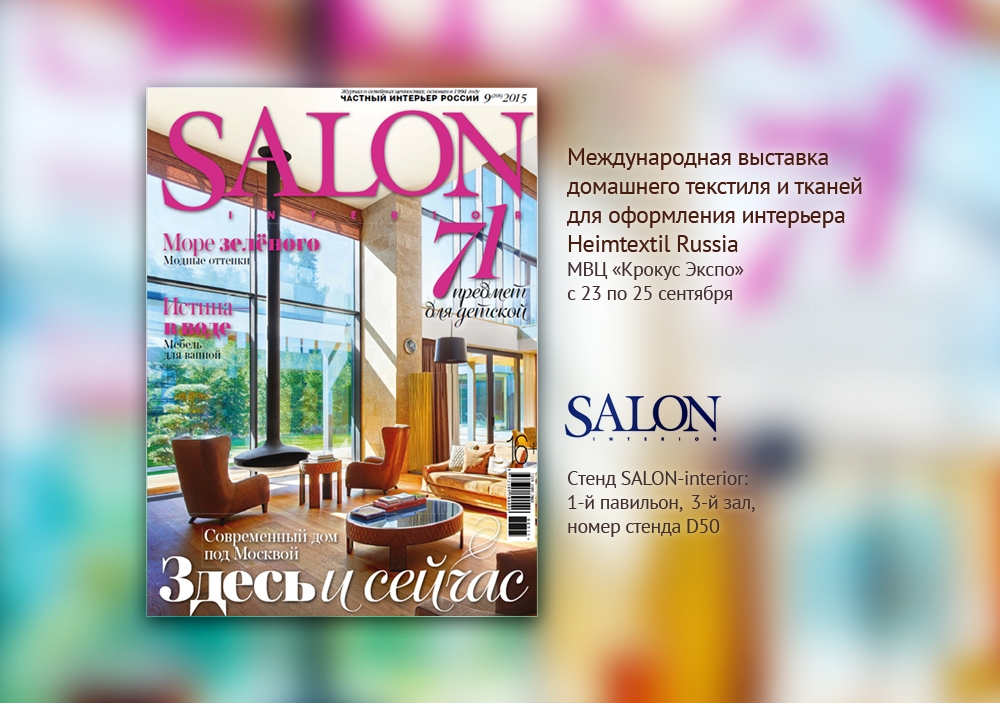 Лидер в своем сегменте интерьерных СМИ, журнал SALON-interior в этом году будет представлен на экспозиции. Все желающие могут посетить стенд SALON-interior: 3-й зал, номер стенда D50.