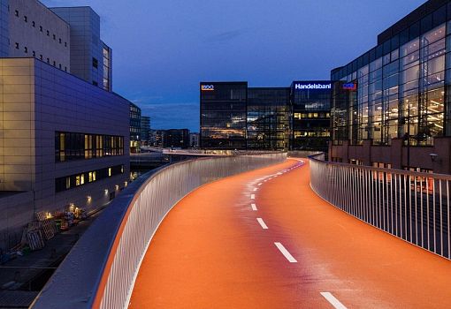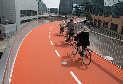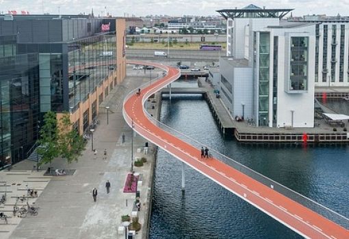 Изящный стальной мост длиной 200 м, поднятый над водой канала и городскими кварталами на 6-7 м – это «велосипедная змея» («Cykelslangen») от бюро DISSING+WEITLING architecture. Многофункциональное сооружение стало ярким элементом городской среды Копенгагена (Дания), обеспечивая свободный проезд для велосипедистов, а также укрытие в случае непогоды. Полотно ярко-оранжевого цвета в темное время суток излучает ненавязчивое свечение. Перспективное сооружение стало первым шагом в реализации череды проектов по улучшению экологии и здоровья граждан.