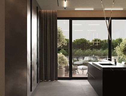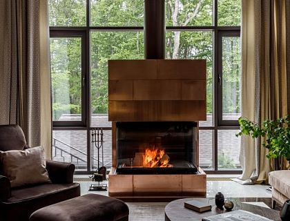 Проект одноэтажного загородного дома. Выполнен в стиле американской классики с использованием натуральных материалов: дерева и камня, шикарной мебели и освещения ведущих европейских брендов