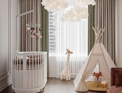 Дизайн квартиры в стиле эклектика ЖК «Глоракс» представляет собой уникальное сочетание разных стилей: здесь и объединенная кухня-гостиная, и две детские комнаты, две ванные, а также шикарная главная спальня с гардеробной, отделенной стеклом. В отделке интерьера предпочтение отдавалось природным материалам, а изюминкой являются смелые цветовые решения, в частности насыщенный оттенок морской волны.