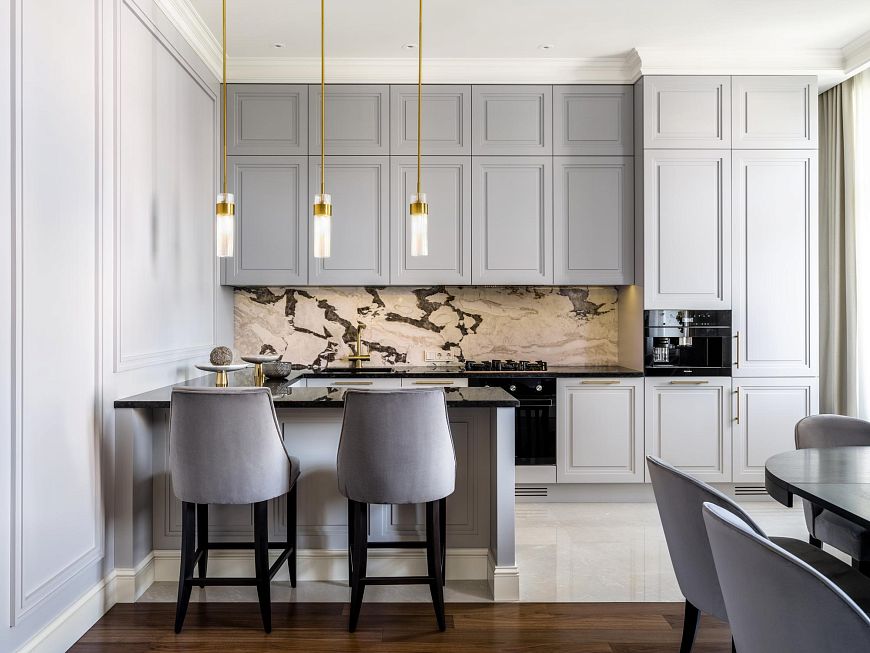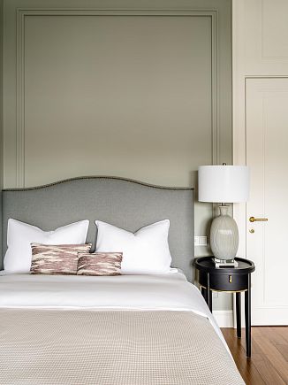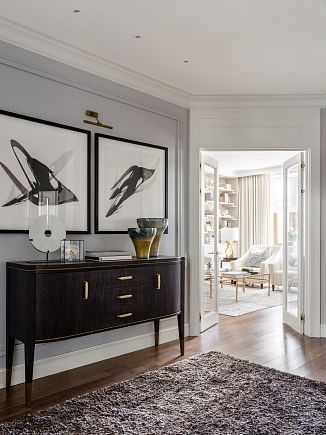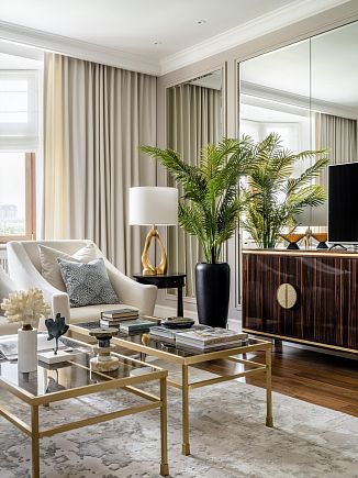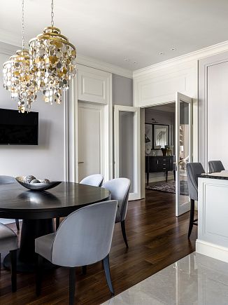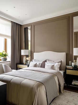 Интерьер оформлен в неоклассическом стиле, вне модных тенденций. Чёткие пропорции, качественные материалы и мягкая цветовая гамма создают атмосферу благородной сдержанности.