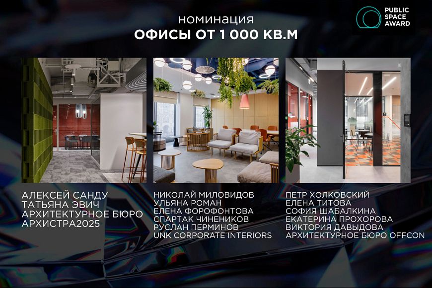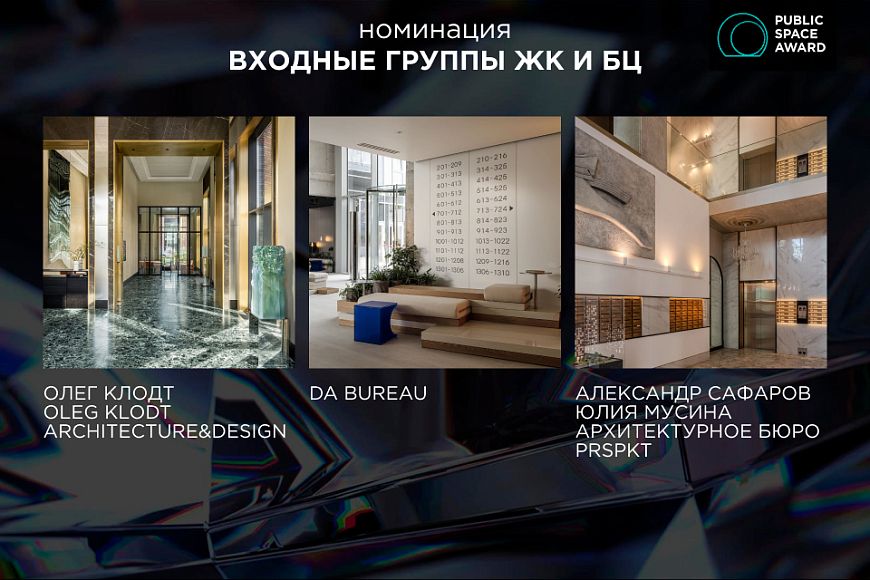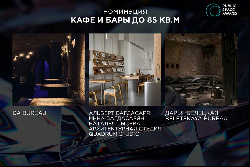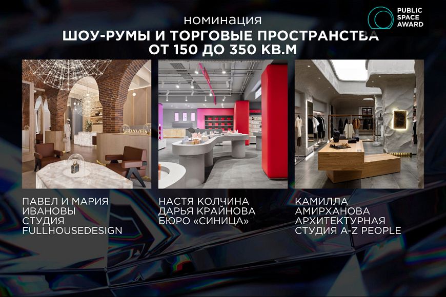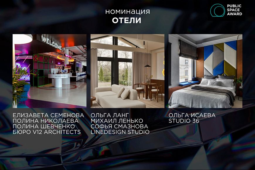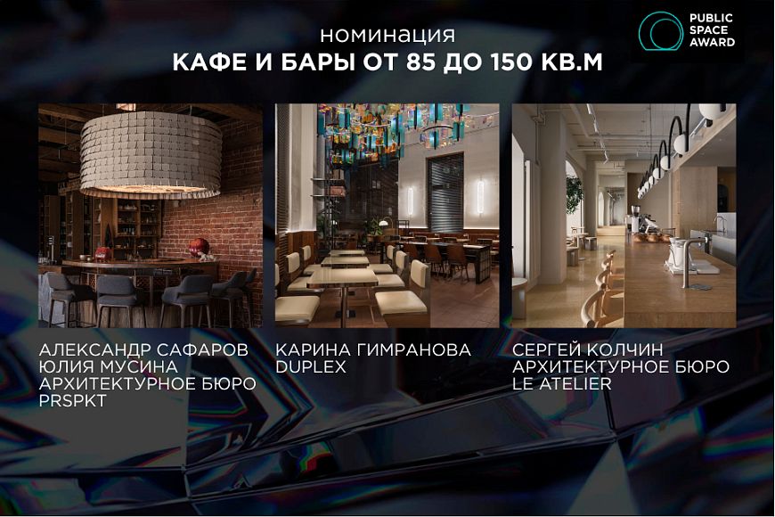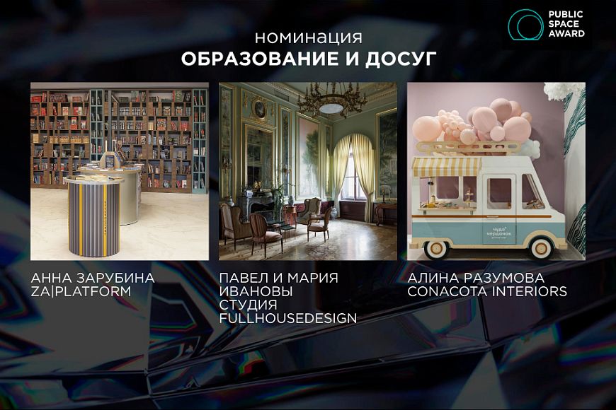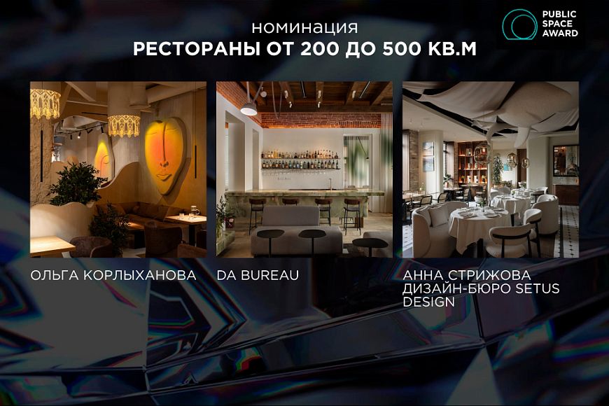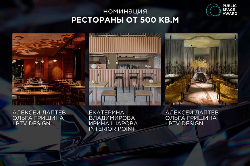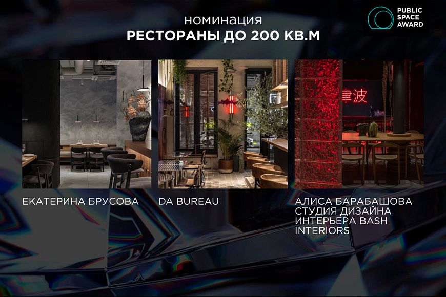 PUBLIC SPACE AWARD охватывает проекты интерьеров ресторанов и кафе, магазинов и шоурумов, музеев и библиотек, аэропортов и вокзалов, клиник и оздоровительных центров, кинотеатров и коворкингов, офисов, салонов красоты, отелей и школ.