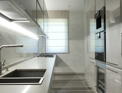 Сердцем интерьера стал камин с трёхсторонней панорамой огня. Его лёгкая, почти парящая форма и мраморная отделка создают динамику и элегантность, а прозрачность конструкции объединяет кухню и гостиную в единое светлое пространство. Это не только архитектурный акцент, но и символ тепла для семьи.