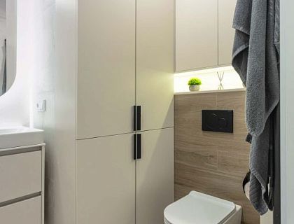 Стильный дизайн проект квартиры с просторной кухней гостиной и двумя изолированными комнатами, во входной части мы предусмотрели гардеробную для хранения верхней одежды.