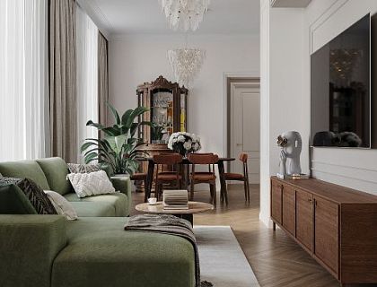 Дизайн квартиры в стиле современной классики на 60 м² объединяет уют и функциональность. Бежевые оттенки визуально расширяют пространство, создавая гармоничную атмосферу. Ассиметричная планировка включает светлую кухню-гостиную с удобной зоной отдыха и обеденным столом. В спальне — элегантность с цветочными обоями и функциональной мебелью. Ванная оборудована душевой и скрытой прачечной, что обеспечивает комфорт и порядок.