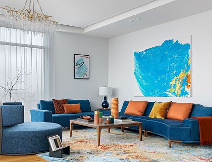 Элегантный неоклассический интерьер с яркими акцентами разработан для трехкомнатных апартаментов в премиальном жилом комплексе в Сочи. Апартаменты находятся на берегу моря, все окна выходят в парк, и цветовая гамма интерьера передает близость к природе. Квартира имела свободную планировку, поэтому интерьер разрабатывался с нуля, начиная с «нарезки» помещений. Важной частью проекта стало интегрирование инженерных решений (вентиляция, умный дом и т.п.) в дизайн апартаментов.